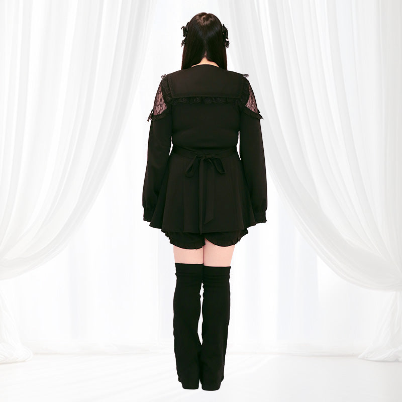 前立てにはパール調のハートボタンを並べ、細部までガーリーさをたっぷり詰め込みました。袖口のレースとフリルも秋冬の重めコーデに馴染みやすく、黒のワントーンでも表情豊かに仕上がります。