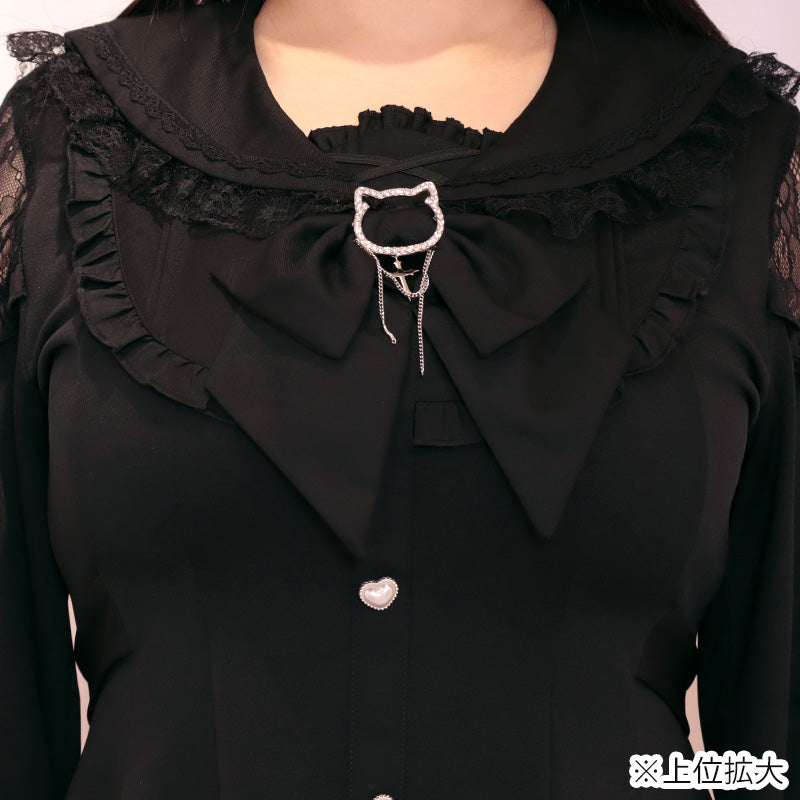 胸元にはオリジナルの猫型リボンブローチをオン。キラキラ光るストーンが顔まわりを明るく見せ、地雷系らしい甘さと大人っぽさを両立。肩には繊細なレースを使い、その下に小さなサテンリボンを添えることで、ブラックでも重くならず、ふわっとした抜け感が楽しめます。
