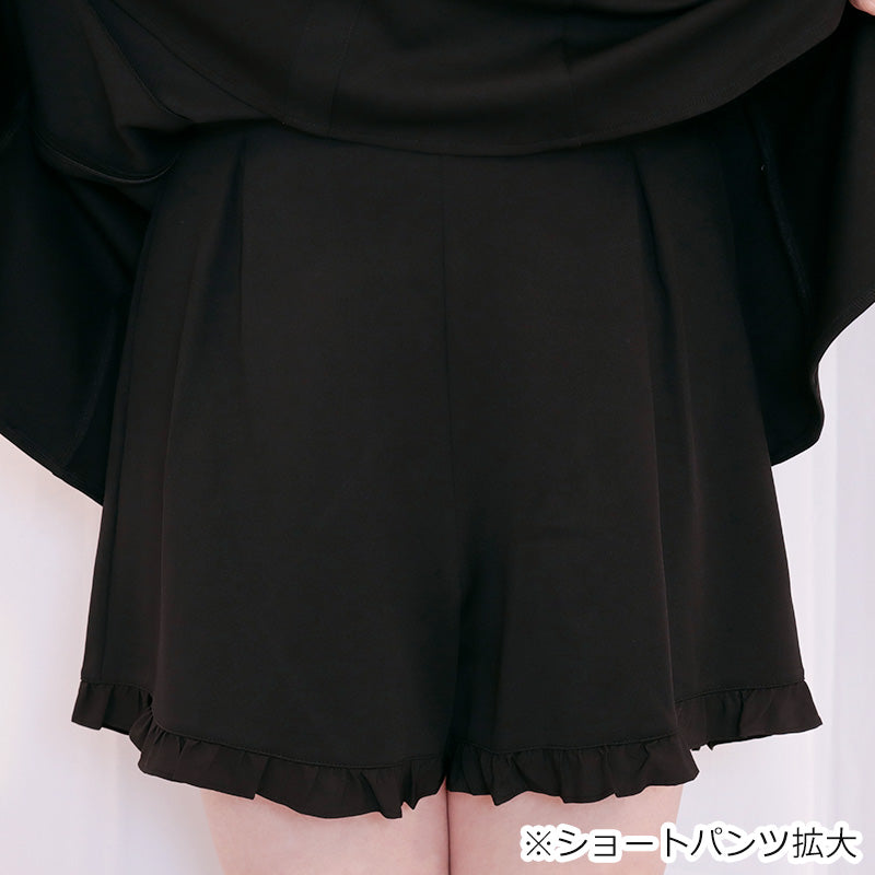 大きいサイズでも広がりすぎないAラインシルエットで、脚がきれいに見えるミニ丈に仕上げました。スカートの内側にはショートパンツがセットになっているので、ライブやお出かけでも安心して動きやすく、ぽっちゃりさんからも好評のシルエットです。